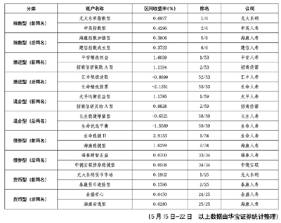 華寶證券統(tǒng)計顯示,5月15日-5月22日,投連險各分類賬戶取得了0.33%的平均收益,絕大部分賬戶實現(xiàn)正收益。其中指數(shù)型賬戶表現(xiàn)較好平均收益率達(dá)到0.45%,而激進(jìn)型賬戶平均收益為0.23%,未能跑贏滬深300指數(shù)。