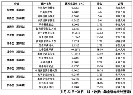 根據(jù)華寶證券統(tǒng)計(jì),5月22日-5月29日,投連險(xiǎn)各賬戶普遍跟隨大盤取得正收益,各投連險(xiǎn)賬戶平均區(qū)間收益為0.47%。然而,仍有5%的賬戶區(qū)間實(shí)現(xiàn)負(fù)收益,其中泰康人壽旗下的泰康優(yōu)選成長型賬戶以-1.5078%的區(qū)間收益率在所有納入統(tǒng)計(jì)的177個(gè)投連險(xiǎn)賬戶中墊底。