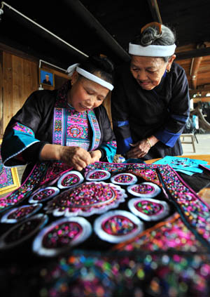 廣西三江侗族自治縣同樂苗族鄉(xiāng)同樂村的“侗族刺繡”藝人在做刺繡。記者 李斌/攝