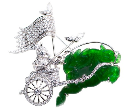 中國人認為馬是行走在地上的龍,陽綠色翡翠戰(zhàn)馬神采奕奕,抬起前蹄好似帶領(lǐng)千軍萬馬勇敢迎敵,由鉆石構(gòu)成的騎士與戰(zhàn)旗輪廓分明、立體富動感,值得人們崇拜與愛護。