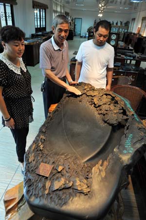 圖為孔發(fā)龍(中)正在硯臺(tái)博物館里介紹他收藏的硯臺(tái)。