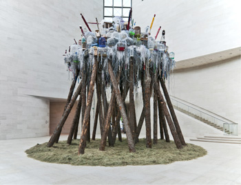 在惠特沃思藝術(shù)館展出的作品中,著名喀麥隆藝術(shù)家帕斯卡爾·馬丁·泰尤專門為本次藝術(shù)展創(chuàng)作的大型室內(nèi)雨林作品《世界分崩離析》,將傳統(tǒng)非洲雕塑和象征物質(zhì)財(cái)富的日常雜物有機(jī)組合,模糊了貿(mào)易商品同神圣事物之間的區(qū)別和邊界,體現(xiàn)了作者在世界經(jīng)濟(jì)文化交流的背景下,對(duì)非洲社會(huì)、傳統(tǒng)文化和生活造成影響的思考與困惑。