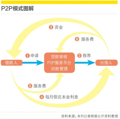 與我們熟悉的民間借貸形式—把錢直接借給熟識(shí)的朋友或親戚,讓對(duì)方寫下欠條,約定還款時(shí)間,有時(shí)還會(huì)約定不同利率,民間借貸公司就是在民間借貸過程中增加了中介信息平臺(tái),這些公司作為中介,將民間的借款人和出借人對(duì)接,形成P2P借貸模式。P2P是peer