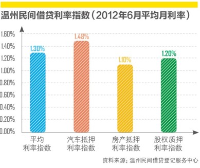 上圖是溫州民間借貸服務(wù)中心公布的每月利率指數(shù),目前6月的平均利率指數(shù)為1.3%,即月息平均為1.3%,年利率在15.6%左右,而當(dāng)期銀行6個(gè)月到1年期的貸款利率為6%。