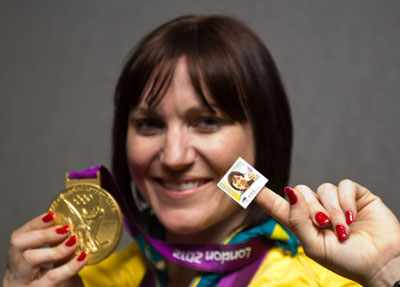 8月21日,在澳大利亞墨爾本市,2012年倫敦奧運(yùn)會(huì)自行車女子爭先賽冠軍米爾斯(Anna Meares)正在展示印有自己頭像的紀(jì)念郵票。當(dāng)日,澳大利亞郵政在墨爾本展示了為本國奧運(yùn)冠軍發(fā)行的紀(jì)念郵票,該紀(jì)念郵票每張面值60分(約合人民幣4元)。新華社發(fā)