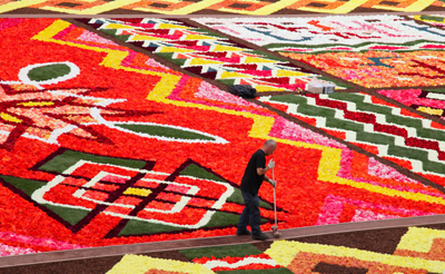 著名的比利時(shí)“鮮花地毯”日前再現(xiàn)首都布魯塞爾市中心的大廣場(chǎng)!磅r花地毯”面積1800平方米,由60萬(wàn)朵鮮花鋪成,其中絕大部分是秋海棠,還有一部分大麗菊。