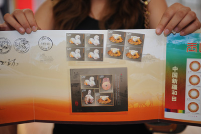 8月28日,在新疆維吾爾自治區(qū)和田市,一名當地市民展示剛剛購買的《和田玉》特種郵票。