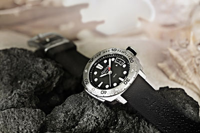 另一款式適合男女佩戴著。表殼直徑38mm,觸目的黑色表盤配以亮眼的精鋼表殼,夜光白色刻度在黑色表盤上更為突出,同樣地,特大的日歷視窗設于3時位置。這個款式一樣配備橡膠材質及精鋼表帶以供選擇。