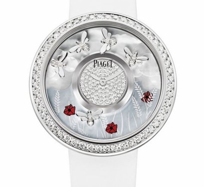 Perignon,竟然還能飄出細(xì)密的泡沫,味道平和,很好入口,一片緋紅很快從杯子移到臉龐上。這個(gè)時(shí)節(jié),你就該戴上鑲有共重2克拉的188顆美鉆的“夏”,讓我欣賞盤上小蜜蜂在飛旋。蔚藍(lán)跟乳白的珠貝背景,表現(xiàn)著朗日高懸?窗桑幸恢恍∶鄯渥祓捔,飛到大紅花與麥穗?yún)仓。夏天有麥穗?幻想是沒有界限的。庭院對面的房間開了,也許出門的是這里的老住客毛姆呢。