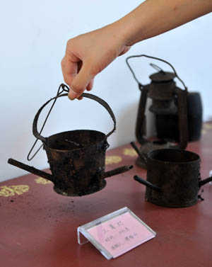 為搜集保存農(nóng)村生產(chǎn)生活工具,廣西恭城瑤族自治縣觀音鄉(xiāng)水濱村2011年建成全縣首個(gè)村級(jí)博物館,展出當(dāng)?shù)剞r(nóng)村生產(chǎn)生活實(shí)物共119件。這些物品絕大部分系村民祖?zhèn)鳎械纳踔潦前倌暌陨系墓哦。博物館自開館以來一直免費(fèi)對(duì)外開放,村黨支部的黨員們義務(wù)任管理員,目前已接待近2000名參觀者。 圖為博物館收藏的三角燈。