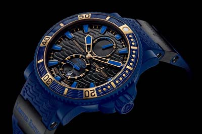 Process)特別處理,令表殼表面覆蓋一層藍(lán)色橡膠涂層,突顯非凡外型和舒適的感覺。透明表背設(shè)計(jì),可欣賞機(jī)芯運(yùn)轉(zhuǎn)之美。