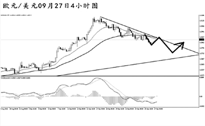 歐元兌美元短線的下跌趨勢保持完好,小時圖下降趨勢線壓制匯價,目前歐元尚未能跌破4小時圖道氏低點支撐1.2855。日線圖上看,此波下行整體是對前方瘋狂上漲的修正,現(xiàn)在歐元仍有一定的下落空間。只要匯價不升破趨勢線阻力1.2910一線,后市將逐步向1.2680發(fā)起沖擊。