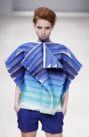 10月14日,在烏克蘭基輔的2013春夏時(shí)裝周上,模特在展示烏克蘭設(shè)計(jì)師Victoria Panyukova的作品。