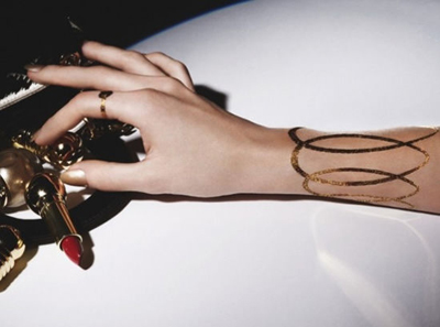 Dior(迪奧)品牌2012圣誕限量彩妝Grand Bal系列推出了一款24K金紋身貼紙?zhí)籽b,其中包括戒指、手鏈、臂環(huán)等印有Dior標(biāo)志的圖案。由Dior珠寶設(shè)計(jì)師Camille Miceli操刀設(shè)計(jì),每套售價(jià)120美元,合約750元人民幣。