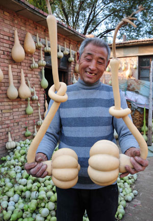 近年來(lái),河北省廊坊市大城縣臧屯鄉(xiāng)九間房村大力發(fā)展工藝葫蘆種植產(chǎn)業(yè),通過(guò)對(duì)葫蘆生長(zhǎng)過(guò)程進(jìn)行人工控制,選擇適當(dāng)時(shí)機(jī),軟化葫蘆、做出不同造型。工藝葫蘆成品具有很高的觀賞、收藏價(jià)值,每年都會(huì)吸引眾多來(lái)自北京、天津、上海等地的收藏家前來(lái)收購(gòu)。目前,全村工藝葫蘆種植面積達(dá)100多畝,年純收入達(dá)150多萬(wàn)元。
