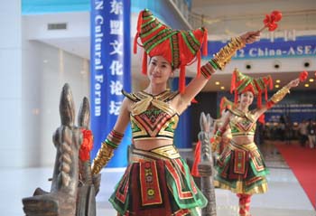 日前結(jié)束的東盟博覽會上,身著民族服裝的姑娘們敲響銅鼓迎接中外友人。記者周華/攝 |