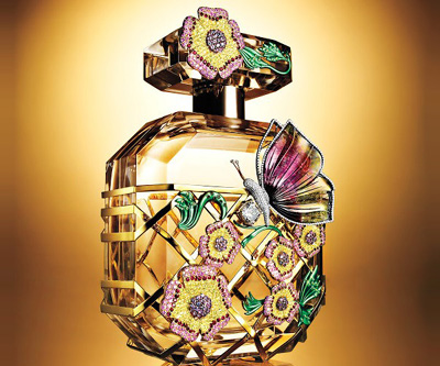 Fantasy。香水瓶上有黃金、鉆石、紅藍寶石的鑲嵌,更配以一只躍躍欲飛的金蝴蝶,令整瓶香水看上去就像是每個女人心中的秘密花園,充滿百香果,牡丹和蘭花的氣息。