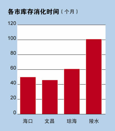 根據(jù)海南克爾瑞的統(tǒng)計(jì)數(shù)據(jù),海南樓盤庫(kù)存量最低的是三亞市,截至2012年11月底,三亞仍需要2年消化完。而其他重點(diǎn)城市如?跇鞘袔(kù)存消化周期長(zhǎng)達(dá)50個(gè)月,文昌需要46個(gè)月,瓊海需要61個(gè)月,庫(kù)存最高的的陵水則需要101個(gè)月。