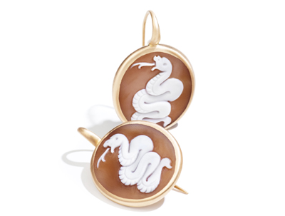 2013年正值中國蛇年,POMELLATO寶曼蘭朵Eva系列運用西方藝術中集繪畫和雕刻之大成的浮雕技法,在寶石上精雕細琢出中國十二生肖之一——蛇的玲瓏形象,以浮雕珠寶獻禮蛇年。神秘、靈氣、力量兼而有之的珠寶佳作躍動指間或蕩漾耳畔,極具新穎獨到之韻味。寶曼蘭朵的工匠們在尊重貝殼原狀的基礎上,在這些厚度僅為1至2毫米的原料上發(fā)揮純熟的手藝和才氣,雕刻出活靈活現(xiàn)的蛇。