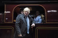 在英國倫敦穆爾蓋特地鐵站,倫敦市市長鮑里斯·約翰遜與蒸汽火車的駕駛員合影。新華社/法新 |