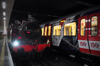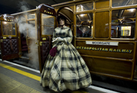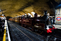 隨著夜色中的一聲汽笛,一輛19世紀(jì)蒸汽機(jī)車?yán)S多利亞時(shí)代的木制車廂駛?cè)雮惗氐罔F穆爾蓋特車站,白色蒸汽從紅色車頭上冒出來,煤氣味在空中彌漫,這一幕似乎把人們帶回到了1863年。那一年1月9日,倫敦開通了世上第一條地鐵線路。
