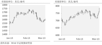 這種格局開始于中國春節(jié)前,并延續(xù)貫穿了整個一季度。貴金屬中,黃金和白銀價(jià)格全部回吐了2012年9月以來的所有漲幅;而鉑金與鈀金,則由于生產(chǎn)供給面臨的短缺,以及未來需求增長可能性的增強(qiáng)而表現(xiàn)明顯強(qiáng)于金銀。
