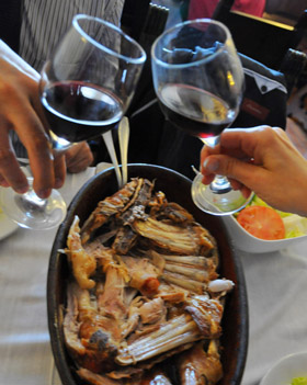 餐館里好不熱鬧,有點摩肩接踵的感覺?救檠蚴怯贸錾挥21天、除了母乳沒吃過任何雜糧的小羊烤制的,肉質(zhì)絕對細膩,口感外焦里嫩,而且比烤乳豬少了很多油脂,吃到嘴里回味無窮。如果再配著喝點上好的西班牙葡萄酒,這一餐,絕對是酒不醉人人自醉。