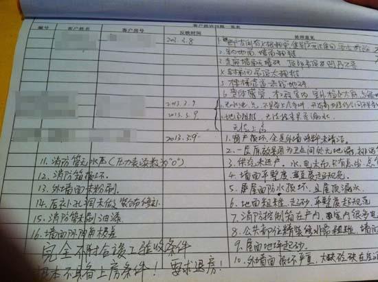 事發(fā)當(dāng)日,柳女士來到綠地商務(wù)城售樓處想討個說法,工作人員讓柳女士在留言簿上寫下自己的意見。柳女士現(xiàn)場所拍留言本簿的照片顯示,3月份有三十余位業(yè)主留下了自己的意見。業(yè)主夏先生3月9日的留言達(dá)16條之多,主要涉及房屋布局與效果圖差異較大、水電暖等基本設(shè)施不到位、房屋施工粗糙等問題。
