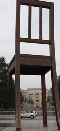 日內(nèi)瓦的另一把椅子是矗立在聯(lián)合國(guó)日內(nèi)瓦辦事處——萬(wàn)國(guó)宮前的斷椅。這把高12米、重達(dá)5噸的椅子只有3條腿著地,第四條腿仿佛被炸去了一截。在萬(wàn)國(guó)宮廣場(chǎng)上,它略顯突兀,并肩身邊的聯(lián)合國(guó)難民署、國(guó)際電聯(lián)、世界知識(shí)產(chǎn)權(quán)組織等林立的國(guó)際機(jī)構(gòu)大廈,仿佛在向路人述說(shuō)斷腿的不幸。