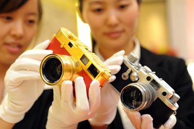 為紀(jì)念萊卡相機誕生100周年,香港仕宏拍賣有限公司將于6月22日在香港舉行萊卡百年精典收藏相機拍賣會,屆時將拍賣198款從世界各地收集來的萊卡稀有藏品。圖為在北京舉行的新聞發(fā)布會上,工作人員在介紹即將拍賣的中華人民共和國建國60周年紀(jì)念版萊卡相機和萊卡IIIG/IIIF相機。