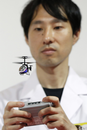 在2013東京國際玩具展上,工作人員展示中國銀輝玩具公司推出的遙控飛機(jī)“納米獵鷹”!凹{米獵鷹”長8.11厘米,高5.09厘米,寬2.24厘米,是載入吉尼斯世界紀(jì)錄的最小遠(yuǎn)程遙控模型飛機(jī)。