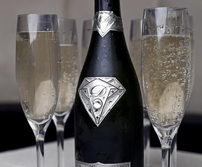 Diamants的香檳酒商出品的這瓶香檳上,它那形似超人標(biāo)志的商標(biāo)用18金打造而成,正中鑲有一顆重達(dá)19克拉的璀璨無瑕的白鉆,代替該品牌平時(shí)使用的施華洛世奇水晶。