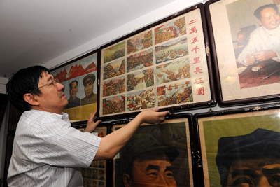 6月30日,程宸將他最近收藏的紅軍二萬五千里長征圖連環(huán)畫掛到墻上并向來賓交流了當(dāng)時(shí)印刷長征圖連環(huán)畫的歷史背景。 現(xiàn)任中國名家書畫研究院副院長的程宸,是我國著名的紅色收藏大家,他從上學(xué)集郵到現(xiàn)在的紅色收藏已有39個(gè)年頭了。多年來,他收藏紅色藏品和有關(guān)毛澤東的像章、書刊、宣傳畫、瓷像、郵品、繡品、油畫等達(dá)20多萬件。