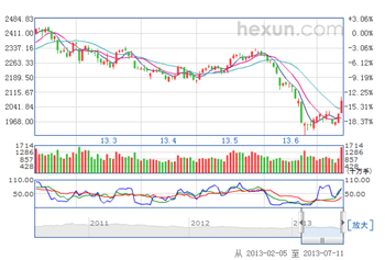判斷大盤震蕩上行的依據(jù)并不是在于政策面出現(xiàn)了一些趨好的跡象,主要是基于大盤的技術走勢。例如在6月25號,大盤在跌破解放底之后,突然加速下跌,下探1849點,如此瘋狂的空頭觸動了監(jiān)管層的政策紅線,立即有大資金把大盤硬硬地托回到1949點之上的1959點,這十分明顯地向市場表明1949點就是政策底,所以大盤在該點位震蕩可以,打滾可以,橫行可以,但不能再次下行,這就是判斷近期大盤的主要參照點。