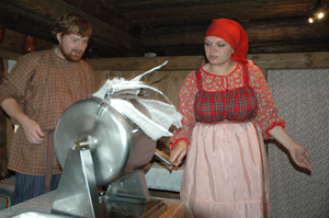 卡佳邀請我們?nèi)ニ易隹,并演示了黃油制作工藝。她拿出一個類似滾筒的機器,把一大桶牛奶倒入滾筒里,在封口處鋪上紗布后密封,就開始不停地轉(zhuǎn)動手柄。這是一道耗費體力和時間的工序,每個人都得到了親自體驗的機會。伴著卡佳和鄰居的動聽歌曲,滾筒在眾多人手中交替轉(zhuǎn)動,十幾分鐘后,打開圓筒,倒出剩余牛奶,留在滾筒里的固體就是黃油了,而倒出的那一部分液體,就是脫脂牛奶。正當(dāng)筆者驚詫于黃油如此神奇地出現(xiàn)時,卡佳說,她們使用的是經(jīng)過加工的放置兩天后的半成品牛奶,制作黃油的整套工序其實是非常復(fù)雜的。