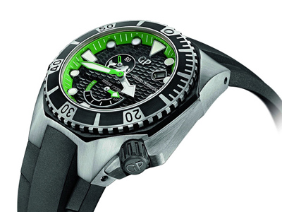 Rockefeller攜手合作設(shè)計,以代表大自然的綠色為主題,表背有美人魚雕刻圖案點綴,以示雙方對保護海洋資源的目標(biāo)。