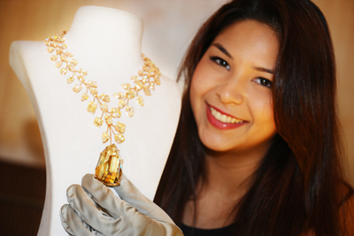 高級(jí)珠寶商懋琬為10月11日至15日舉行的新加坡珠寶節(jié)向媒體展示鉆石項(xiàng)鏈,項(xiàng)鏈墜為重達(dá)407.48克拉的天然黃鉆“無與倫比”。