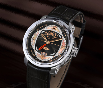 詩意表盤的復(fù)雜結(jié)構(gòu)為品牌自創(chuàng),采用花型圖案來加強(qiáng)不同裝飾的效果:整體射線圖案;四個(gè)時(shí)區(qū)的半月形圖案,采用了罕見的米色珍珠母,而分鐘顯示則采用了赤金;小時(shí)顯示為羅馬數(shù)字,表盤四周分鐘為阿拉伯?dāng)?shù)字。紅色鏤空劍形指針,讓第二時(shí)間區(qū)域極易辨認(rèn),而處于12點(diǎn)位置的「日相」,則運(yùn)用日升和日落來延續(xù)了品牌系列的詩意。