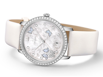 獨(dú)特的珍珠貝殼表面綴飾蝴蝶圖案,并以鑲嵌在18K白金底座上的9顆美鉆點(diǎn)綴部份小時(shí)刻度位置,6時(shí)位置則設(shè)有日歷窗。表盤上的蝴蝶圖案靈感來自中國傳統(tǒng)文化,象征著愛與恒久。7時(shí)及8時(shí)位置飾有以鉆石拼出的蝴蝶圖案,襯托鋪鑲50多顆全切割鉆石的18K白金表圈。光面時(shí)分秒針亦以18K白金鑄造,與表殼及裝飾細(xì)節(jié)如出一轍,互相呼應(yīng);」靶畏滥p藍(lán)寶石水晶鏡面內(nèi)外均經(jīng)過防反光處理,完美保護(hù)這個(gè)栩栩如生的動(dòng)人表面。
