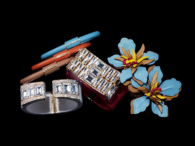 設(shè)計(jì)靈感來源于上世紀(jì)四十年代高級珠寶的創(chuàng)意和誘人魅力,Prada推出了一系列頗具現(xiàn)代感的珠寶,包括手環(huán)、手鐲、手鏈和耳飾。
