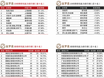 從券商研究能力方面來看,1月中小券商的薦股成功率優(yōu)于大券商。湘財(cái)證券1月共有29份研究報(bào)告到期,其以總體79.31%的薦股成功率位列本月金羅盤券商研究能力排行榜單第一名。湘財(cái)證券旗下分析師余李平、黃順卿等推薦的個股短線測評均有30%以上的漲幅。民族證券薦股成功率也超過70%。此外國海證券、國聯(lián)證券也表現(xiàn)不俗,薦股成功率近65%。而廣發(fā)證券、申銀萬國、中金公司等大券商因薦股成功率不高,在后十名位置出現(xiàn)。