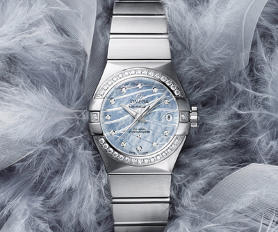 歐米茄星座系列“Pluma”腕表的直徑為27mm,,該款腕表最別具匠心的設計是其珍珠貝母表盤,有兩種色彩可供選擇。一種是天然白色,另一種是把白色珍珠貝母表盤的底面涂上深色的顏料,使其呈現(xiàn)出藍色。嵌入表盤的表圈上標志性的“托爪”呈現(xiàn)柔和的波紋圖案,讓人聯(lián)想到羽毛的紋理。表盤上11個時間刻度均采用18K金鑲嵌鉆石,讓表盤更加熠熠生輝,魅力四射。