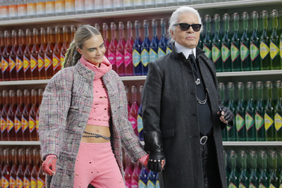 在巴黎時(shí)裝周應(yīng)接不暇的各大品牌發(fā)布會(huì)中,香奈兒的秀場(chǎng)總是別出心裁獨(dú)樹一幟。今年,著名設(shè)計(jì)師卡爾·拉格費(fèi)爾德將位于巴黎大展覽館(又名大皇宮)的秀場(chǎng)變身為一個(gè)“大超市”,模特們身著新款成衣穿行其中,別有一番趣味。圖為卡爾·拉格費(fèi)爾德(右)與模特卡拉·德萊文涅在時(shí)裝秀結(jié)束時(shí)向觀眾致意。
