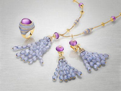 Bvlgari推出的Spindle系列珠寶秉承了品牌的傲人傳統(tǒng),探索著新穎、鮮活而大膽的色彩組合——藍(lán)玉髓與紫水晶、黃水晶搭配,在密鑲鉆石所散發(fā)的點(diǎn)點(diǎn)璀璨光輝的映襯下,愈加呈現(xiàn)出溫潤柔和的獨(dú)特美感。