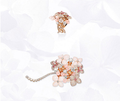 純凈白色的色調(diào)之中暈染一抹象征剛萌芽情懷的粉嫩色調(diào),寶石變成為一朵朵花卉,當(dāng)繡球花展開,便成為無(wú)數(shù)由粉紅碧璽組成的花朵,玫瑰金上是精雕細(xì)琢而成的蛋形蛋白石和粉紅色藍(lán)寶石。純凈的美鉆巧妙地結(jié)合彩色寶石,展示珍貴寶石的浪漫一面:一枚盛開著的繡球花戒指,一枚仿如隨風(fēng)搖動(dòng)的胸針,一枚優(yōu)雅精致的神秘腕表,或一條可轉(zhuǎn)化成短項(xiàng)鏈和手鏈的多功能長(zhǎng)項(xiàng)鏈。