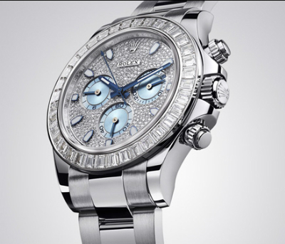 蠔式恒動(dòng)宇宙計(jì)型迪通拿鑲鉆腕表,將氣派顯貴的950鉑金與品質(zhì)純凈的閃爍鉆石巧妙融合。除了冰藍(lán)色計(jì)時(shí)盤(pán),整個(gè)表面密鑲鉆石。這表面顏色僅勞力士鉑金腕表所獨(dú)有。華麗奪目的外圈鑲有36顆方形切割鉆石。