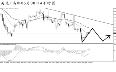 美元兌瑞郎4小時圖強動能交替節(jié)奏頻繁,但下跌趨勢不變。短線匯價有一定的上行需求,但想直接升破趨勢線阻力的概率不大,預計后市仍將以震蕩走弱的節(jié)奏運行。