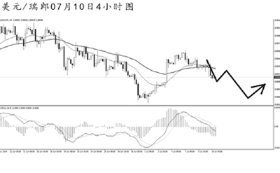 美元兌瑞郎小幅沖高后重新回落。4小時(shí)圖均線系統(tǒng)重新被跌穿,匯價(jià)有望重新向0.8855的前方低點(diǎn)發(fā)起挑戰(zhàn)。短線主趨勢轉(zhuǎn)為向下,但下跌幅度并不算深。預(yù)計(jì)匯價(jià)面臨一定的回調(diào)需求,但后市繼續(xù)走弱的概率較大。