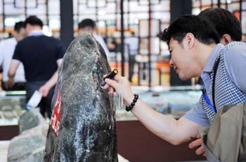 在2014哈爾濱國際珠寶玉石博覽會(huì)上,一位參會(huì)客商在查看一塊俄玉原石。記者 王建威