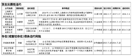 2014年3月4日晚間,上海超日太陽能科技股份有限公司董事會(huì)發(fā)布公告,宣布2011年公司債券第二期利息無法按期全額支付,從而構(gòu)成國(guó)內(nèi)首例債券違約事件,并拉開了2014年債務(wù)違約的序曲。截至7月,市場(chǎng)上發(fā)生實(shí)質(zhì)性違約及有違約風(fēng)險(xiǎn)提示的債券下表。